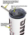 Straw and spill proof locking lid included. Straw type may vary depnding on availablity may be stainless, plastic, straight or bent.